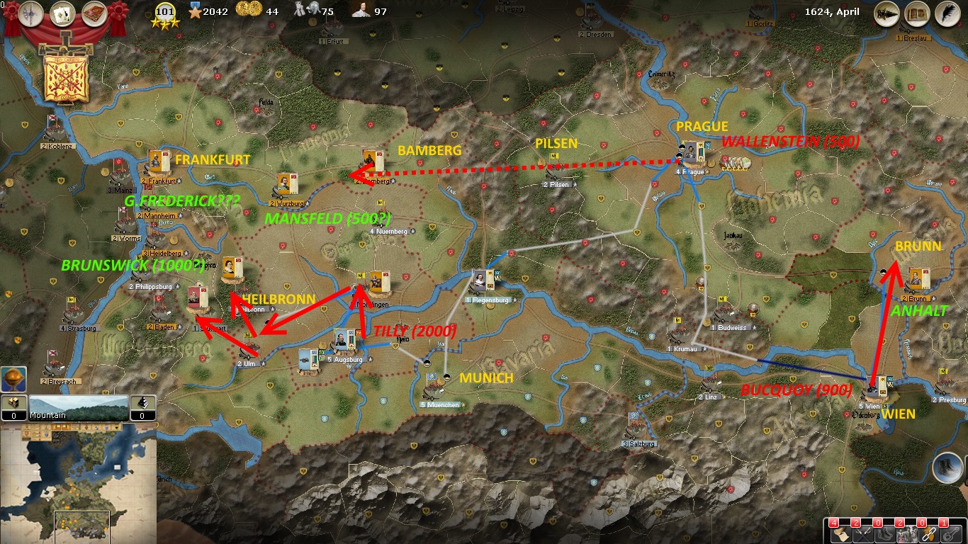 Over the winter Tilly relieved the siege of Nuernberg, and Bucquoy and Marradas stayed in garrison at Budweiss and Wien respectively. Surprisingly Count Thurn chose to move west and is currently besieging Frankfurt. Mansfeld moved just south of Wien but his force must be terribly weakened after a winter in the snowy hills. Other Protestant forces are at Brunn and Mannheim.