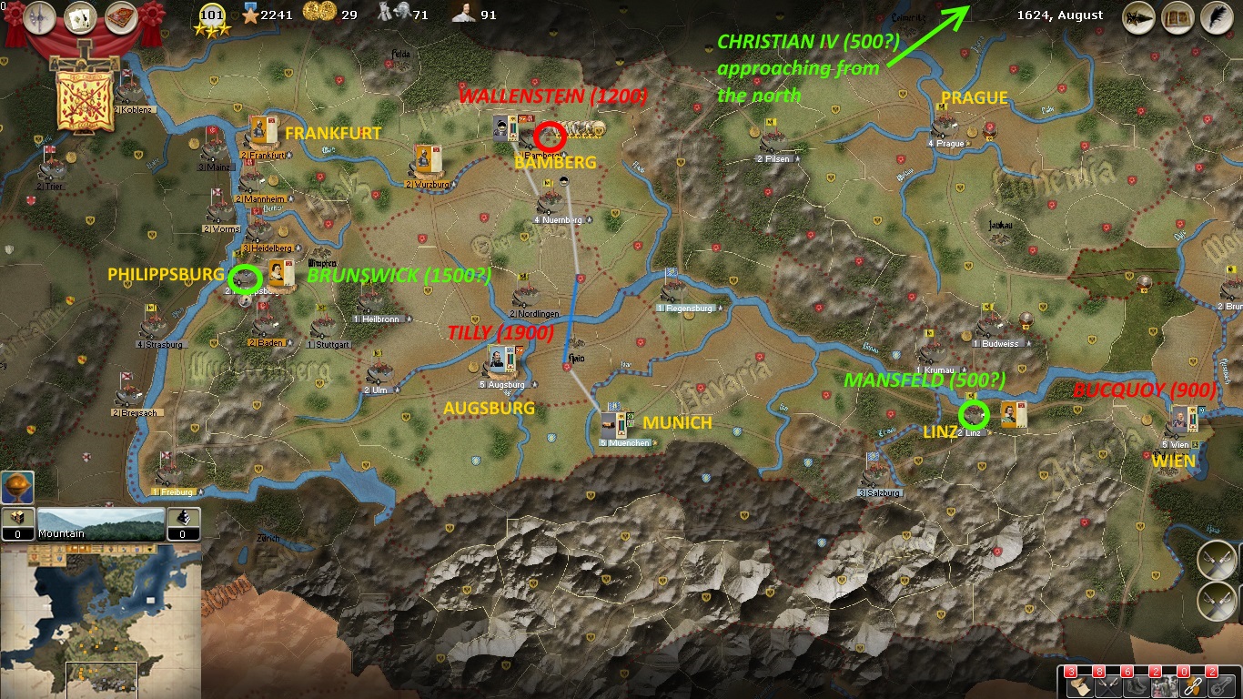 Tilly reaches Augsburg and finds a Protestant cavalry regiment harassing the city. They will be dispersed shortly. Then the good Count will rest his force at Augsburg and keep an eye on Brunswick and his army. Wallenstein reaches Pilsen and will now move on Bamberg. Bucquoy arrives at Brunn and will continue south to Wien. The large Protestant army under Brunswick remains at Philippsburg, besieging the city. The most surprising move is that of Mansfeld, moving swiftly eastward with a small force. He is approaching Linz and may threaten Munich, Linz, Prague or even Wien. Bucquoy will soon be in a position to deal with him.