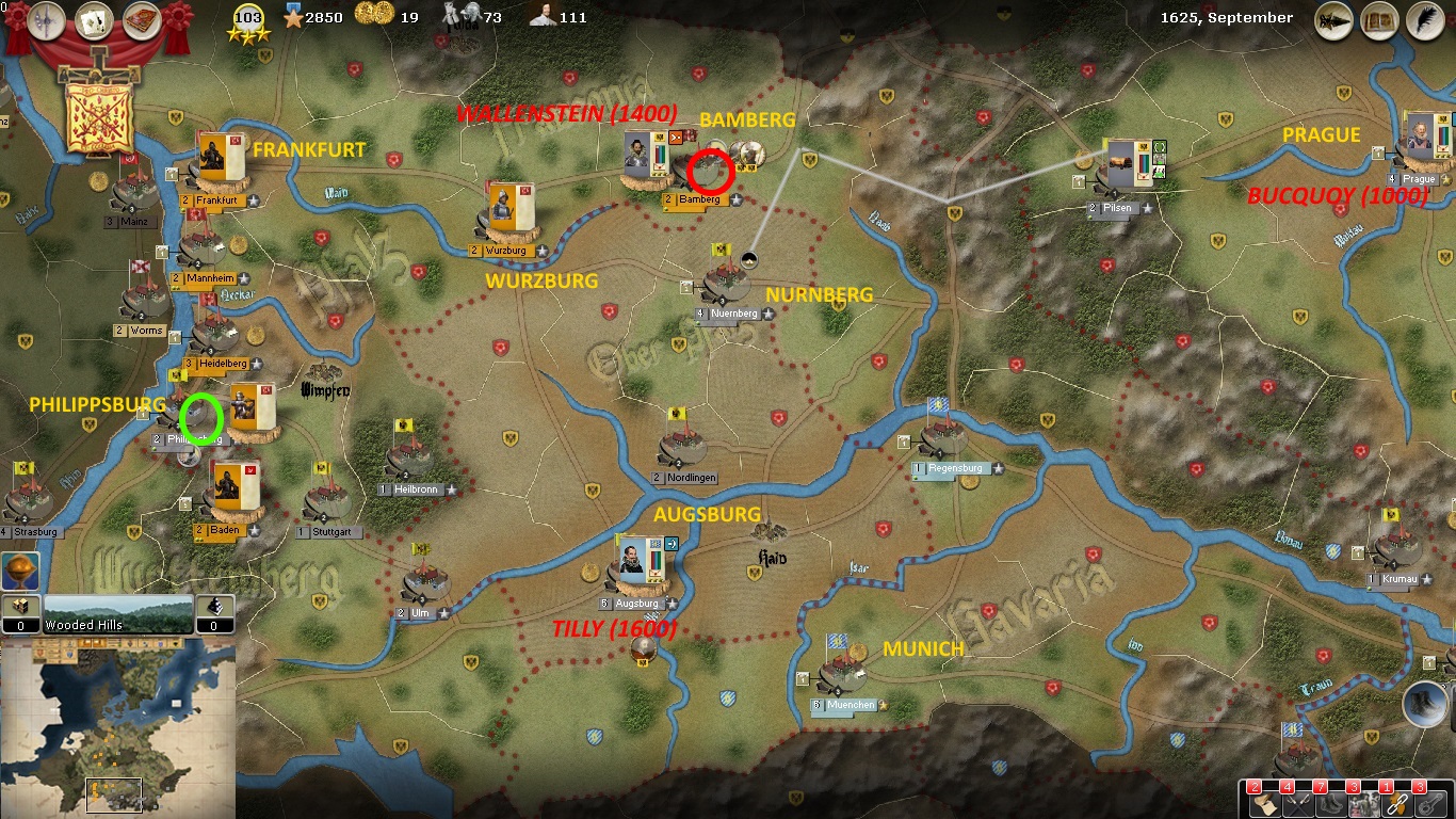 The Protestants in the Palatinate have been almost somnolent, with only a small siege at Philippsburg ongoing. The whereabouts of Brunswick, Mansfeld, Thurn, George-Frederick and their forces is unknown. Christian IV has returned to northern Germany and is besieging Magdeburg. CP is at 111 and funds are still low.