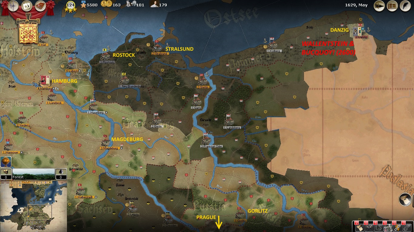 Wallenstein and Bucquoy made it to Prague safely and without too much loss (35 gold in replacements). Unfortunately, Ferdinand II now decides to remove Wallenstein from command, with General Aldringer taking his place. in 1629 the Protestants captured Munster but were unable to seize Bremen or other Imperial cities in northern Germany. The money and EP woes of the heretics continue.