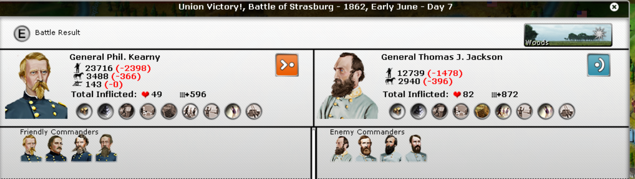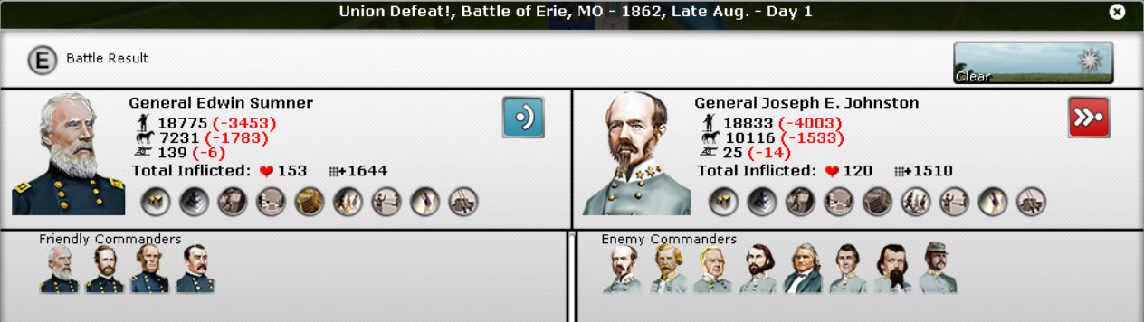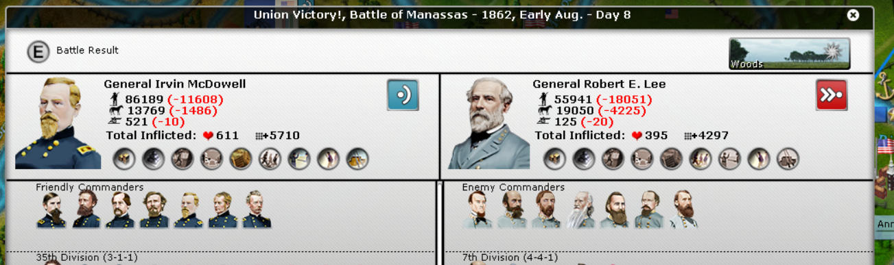 In the East, another Union victory by McDowell. Johnson had 2 victories and become Super-Johnson. McDowell hasn't done anything yet in terms of experience. Butler's 2 divisions were smashed.