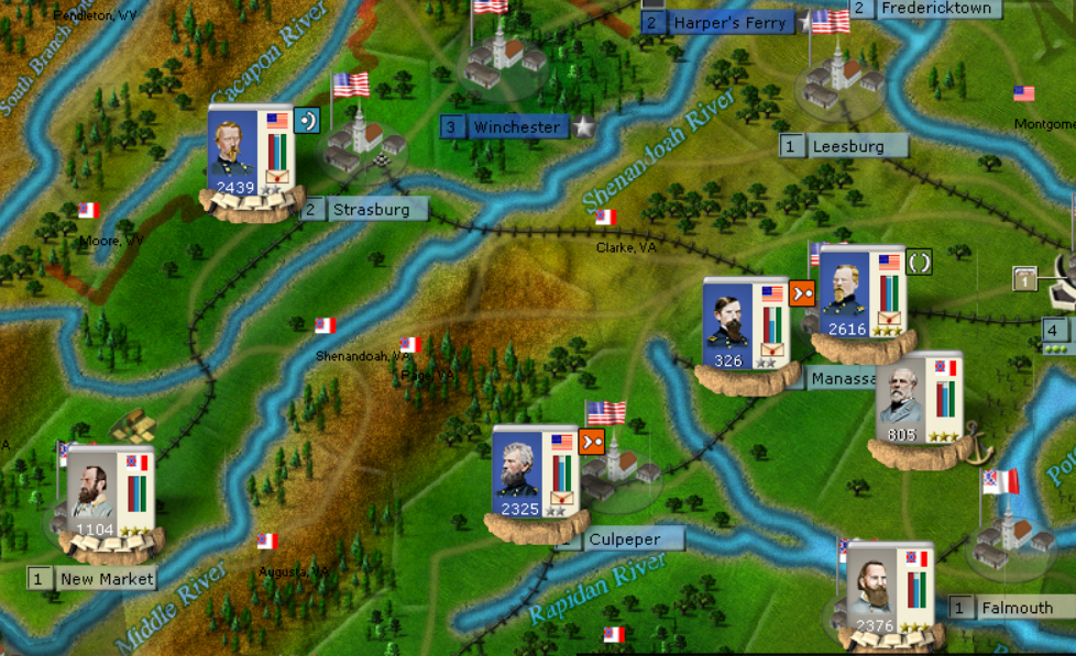 We'll see of the CSA complies. My goal in the East is to hold the line from Harpers Ferry down to Alexandria. For me this is a critical objective. If the CSA is able to get that line (3 regions), the Potomac enables mutually supportive corp to easily defend that line and the CSA can start pulling divisions off the line for use elsewhere. If the USA can hold that line, then the CSA has a much larger swath of land to defend. From Falmouth, Manassas dwon to Winchester must be held. 5 regions vs. 3. A very big difference and the USA can play small ball and start moving corps into the open regions in order to force either CSA response or a pull back. This is the difference between holding the strategic initiative vs. losing the strategic initiative and pure defense.