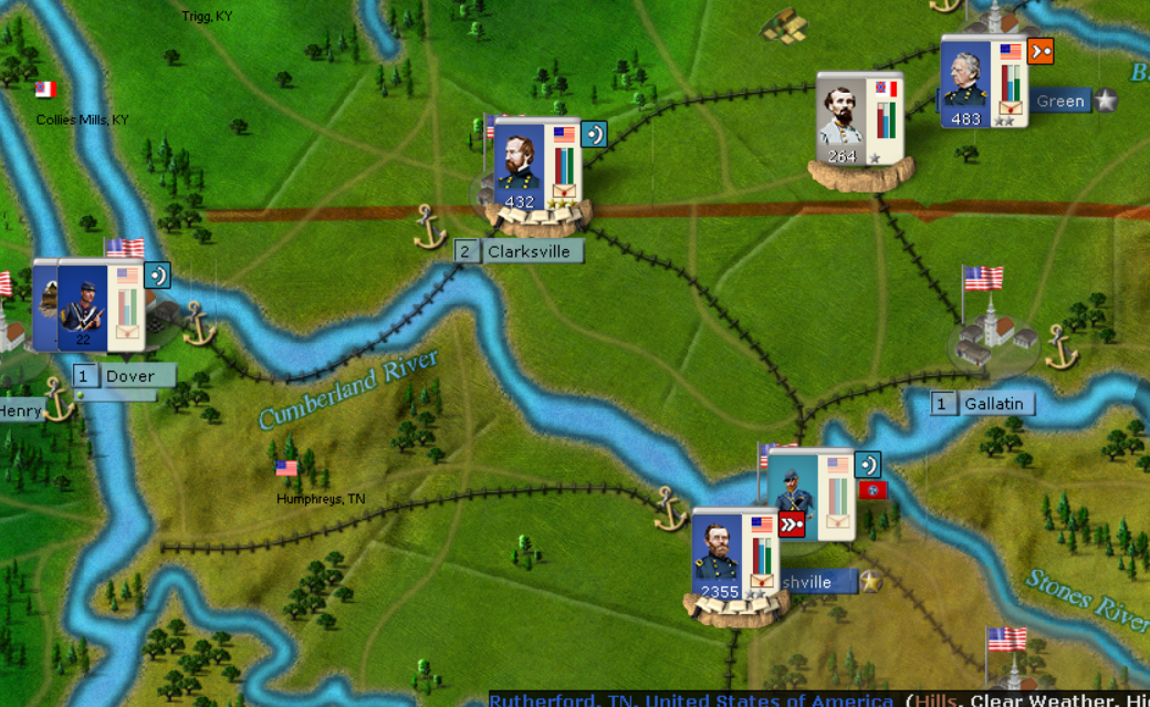 In the West, Grant has taken Henry and Donnelson. While Kentucky remains neutral, I'm pushing all units into the gap. Still a risk as the CSA navy can possibly dislodge. I have 7 riverclads to face against the Rebels.