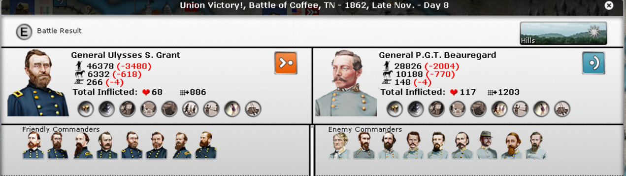 Grant pushed out of Donnelson towards Nashville and engaged Beauregard. This is Grant's 4th victory of the war. In my first game with John, Grant invaded Jefferson City and was immediately promoted. In this game, nothing. The way experience works is really a mystery to me.