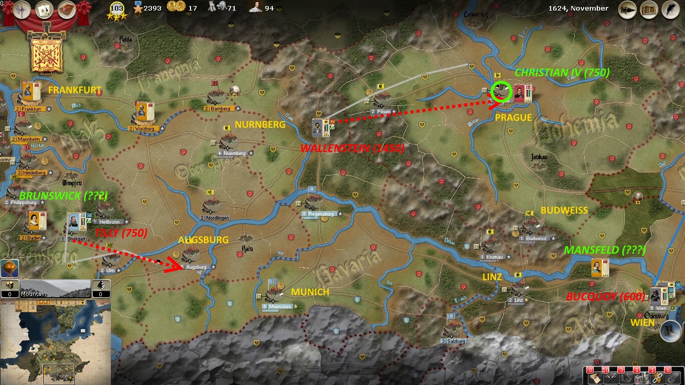 Wallenstein broke the siege of Prague and Christian IV and his army were last seen moving northwards. Mansfeld and what is left of his army moved west and is now near the Donau at Nordlingen. Tilly is at Augsburg and Brunswick is at Baden. Bucquoy and his army are still recovering at Wien.