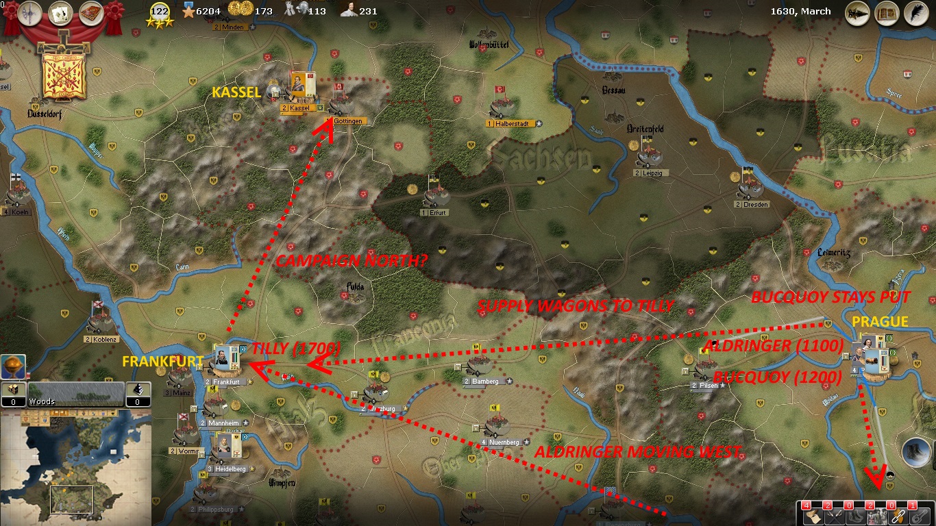 Bucquoy will stay at Prague to keep an eye on Bohemia. Aldringer will move west (via Linz due to supply issues) towards Frankfurt. Additional supply wagons will move through Pilsen to Frankfurt. If they reach Tilly in time he will move north to seize Gottingen and Kassel. The Protestants are very weak (CP 48%) but that situation will not last forever. Sweden and France are making disquieting moves towards supporting the heretics financially and perhaps even militarily. The Protestants must be crushed soon and once and for all!