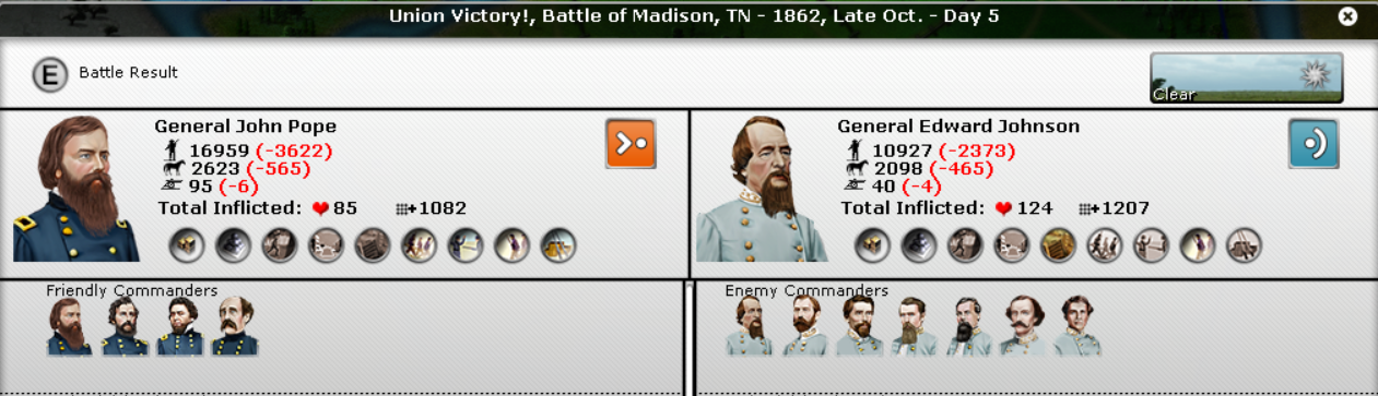 In the East, another Union victory by McDowell. Johnson had 2 victories and become Super-Johnson. McDowell hasn't done anything yet in terms of experience. Butler's 2 divisions were smashed.