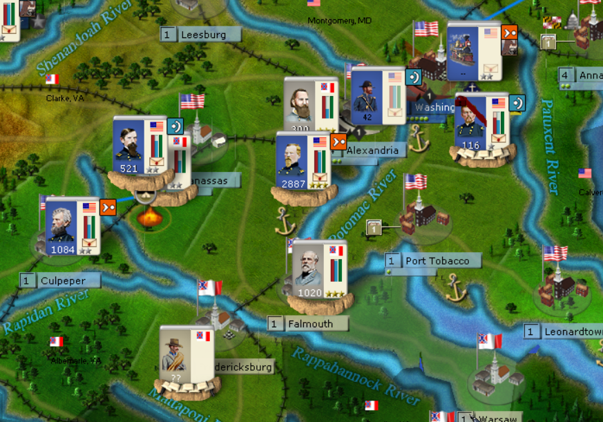 We'll see of the CSA complies. My goal in the East is to hold the line from Harpers Ferry down to Alexandria. For me this is a critical objective. If the CSA is able to get that line (3 regions), the Potomac enables mutually supportive corp to easily defend that line and the CSA can start pulling divisions off the line for use elsewhere. If the USA can hold that line, then the CSA has a much larger swath of land to defend. From Falmouth, Manassas dwon to Winchester must be held. 5 regions vs. 3. A very big difference and the USA can play small ball and start moving corps into the open regions in order to force either CSA response or a pull back. This is the difference between holding the strategic initiative vs. losing the strategic initiative and pure defense.