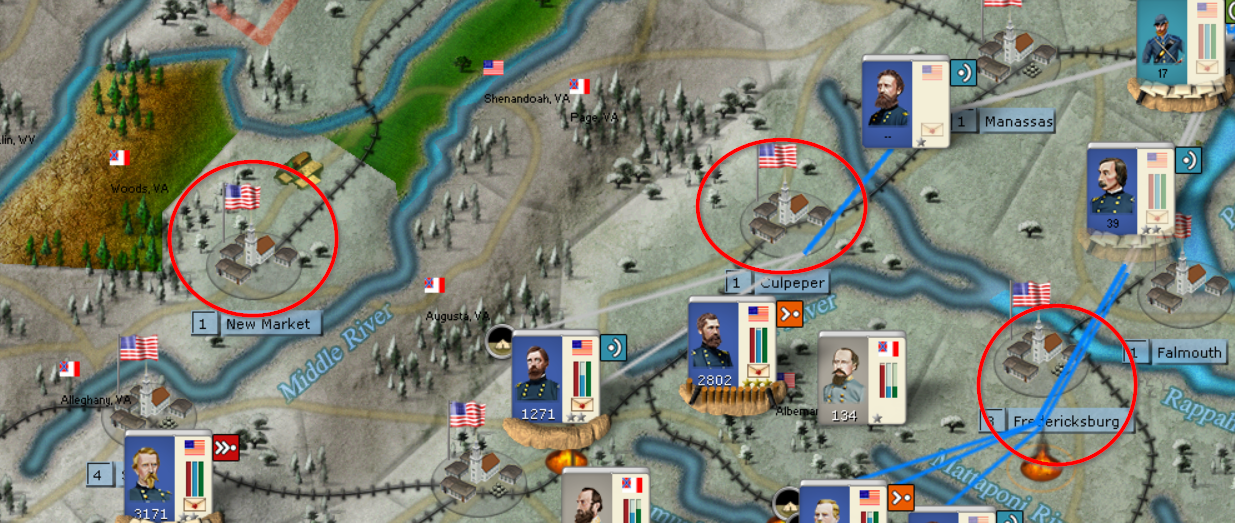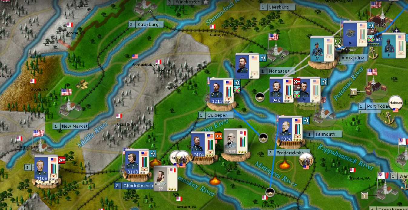If the Alexandria line is broken, the next spot to defend is Culpepper and Frederickburg. They are mutually defensible. So I'd get militia entrenching there from the beginning Level 5+ entrenchments would be difficult to break. The counter is the Union attempts to flank again through WV. The best defense of WV is New Market. The Union can't bypass and one full strength corp could defend there against a LOT. Again a militia entrenching there from the start would help.