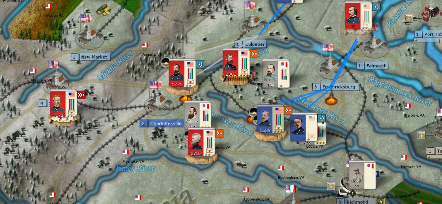 John has accepted surrender. McDowell, Milroy converged in Late February onto Richmond, won a battle against Lee. Richmond held out but the remaining corps of Kearny, Howard and Reynolds were converging on Richmond. I didn't see turn results, but really didn't have to. The manpower advantage was simply too much for the Rebels to overcome.