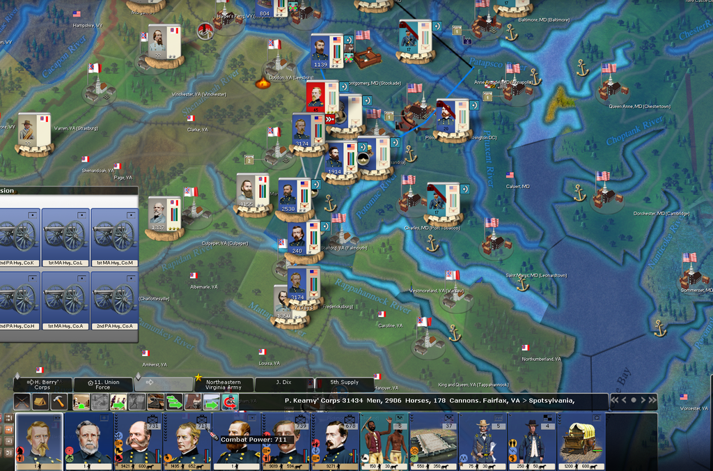 So we are moving our 2 corps out of Harrisburg and toward Alexandria. I still don't see a 3 star here for Elxaime so not sure what he is planning, he can't form corps without a army commander. So what I am doing is sending my small cavalry division to Stafford VA, one region across from Fredericksburg. We will look to make a move behind Longstreet on either Culpepper or Fredericksburg itself and perhaps cut him off from Richmond. We are also forming two more divisions to reinforce New Orleans and sending General Buell there to take command. He raises loyalty levels up to 75%, so we will form 2 corps down there with him remaining in NO with an entrenched division and some artillery from the forts we are beginning to take in the area.