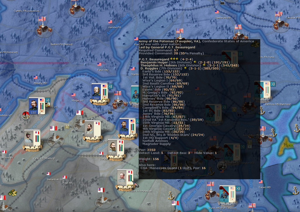 Here is the current situation in NVA at the moment. I have McDowell with 16/16 CP sitting in Alexandria with around 13k men and 106 cannon, including the fort cannons and 0 CP brigade from fort Alexandria, which is why he is locked. I believe this to be wise as MTSG is nowhere near to being unlocked, so this a one region defense. The rest of his army is continuing to reinforce in the Alexandria fort waiting to see if PGT bolsters his forces before adding to McDowell's CP. Also I am sending a force of about 7k men and 40 cannon northwest to Leesburg to begin digging in. Also you can see that we are in control of Harper's Ferry which we held without a single battle, so I am bringing additional forces in here as well. Basically I will do my very best to hold this three region line across the south of the Potomac and place militia units north of the river to begin forming fallback positions. Its suicide to attack the as the USA this early in the game and after having tried it in multple PBEM's I just can't bring myself to order the senseless murder of so many digital men. :)
