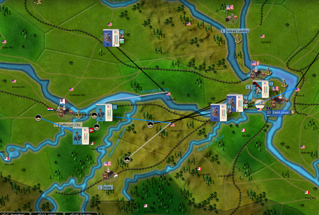 Next turn I hope to be able to move on Springfield and pray Lyon's is active. If we can take Springfield before the winter I will consolidate there and I'm not sure if I'll go any further for a long time. Knocking those Missou units out of his force pool will be my first priority.