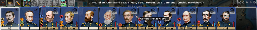 Elsewhere, Little Mac has arrived in Harrisburg to begin the training of the Volunteer brigades there and I believe Halleck pops up soon, so will can send him there to help as well. I have also formed another army under Butler :wacko: ....Yikes...to head to HF to up the CP there. We will see how that goes. Not good I'm sure, but I'm left with little options. I have Baker in DC as a recruiting officer and Little Mac will be doing his training.