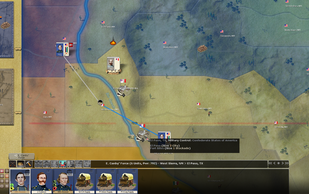We are going to make a move here. Canby will move out from Tucson and will take 2 full turns to arrive near El Paso. We will then send Carson down as well and see if two divisions may have the chops to take it. If not, we might starve to death but eh, it's not that important here so why not take the risk.