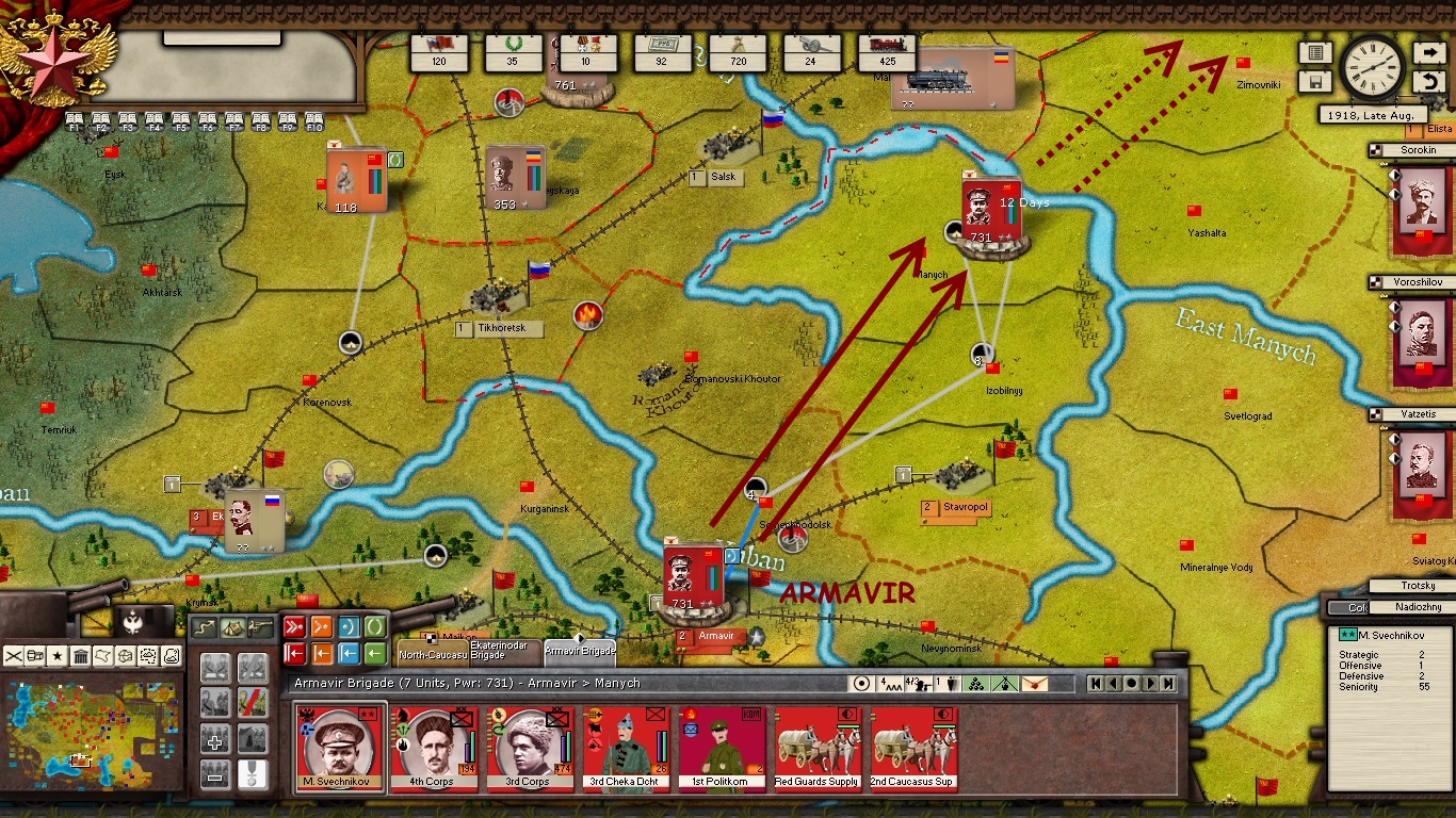 Facing these threats, the Reds have large but disorganized forces at Tzartisyn, near Armavir in the Caucasus, and smaller forces are located in the East, at Moscow and Petrograd.