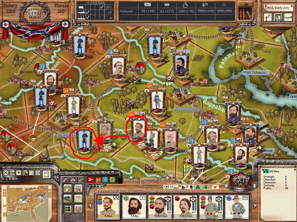 OVERALL SITUATION: I have had setbacks, due to not being smart about entrenchments. I am now using small units to dig-in in depth, but I feel like I would not have lost Nashville so early, or had so many problems in Viriginia, if I had mastered handling Corps a little better. I am still pretty fuzzy on how CORPS work together, attacking one seems to bring several in the battle.