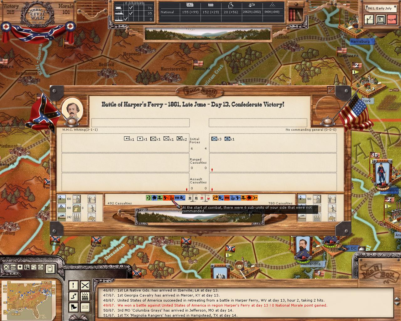 Caltone wrote:What a game! I just started up an Apr 61 campaign as the South and proceeded to learn that all my old starting moves aren't working against the AI anymore. I'm getting pressed on all fronts. The AI is making sound moves and currently has me on my heels. I love it, thanks team!