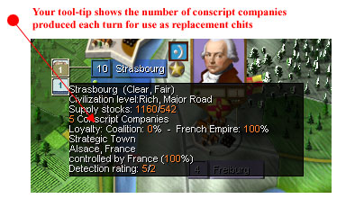 Each game-turn, specific regions on the map generate ‘conscript companies’ and money. By holding the mouse over regions on the map, the tool-tip feature indicates how many ‘conscript companies’ and/or how much money is produced in the region. Note that not every region produces conscript companies and/or money.