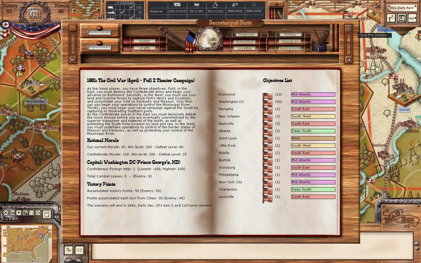 An update on my game. By December 1861, New Orleans, Mobile and Norfolk have become CSA cities; both on the Objectives screen and on the map. It is now September 1862 and there have been no further changes.