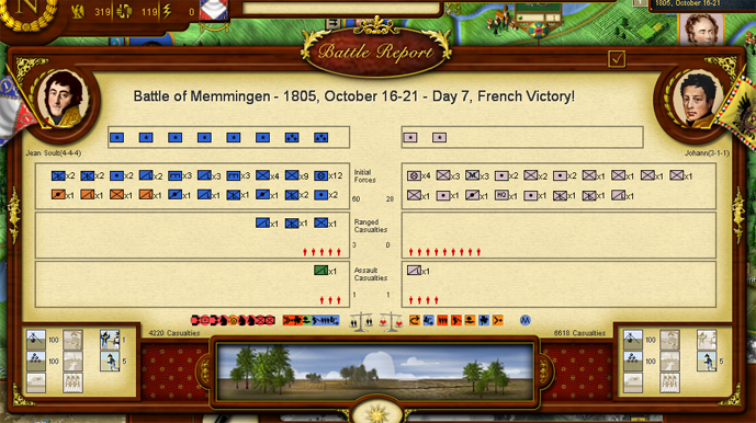 Davout’s attack on Munchen was only partially successful. The attack kicked off under muddy conditions and failed to develop the momentum needed to dislodge the Coalition defenders. After suffering nearly 10,000 casualties, the Coalition force withdrew into the city. A significant number of Coalition units were routed in the battle leading me to conclude that their cohesion levels are low.