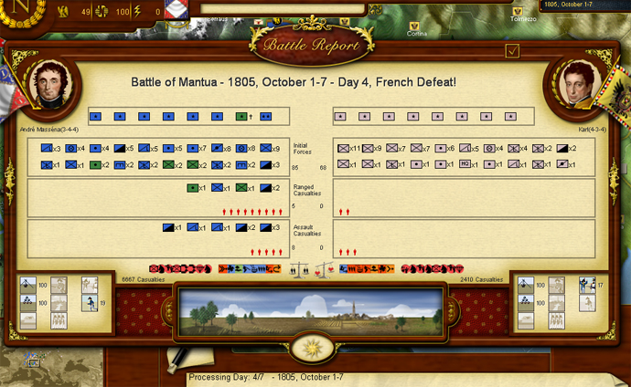 South of the Alps, my effort to lift the siege at Mantua has been successful. After fighting a major battle with Archduke Karl, Massena and St. Cyr have affected a link-up. As you can see from the battle report, both sides suffered heavy casualties (9,000 to 10,000).