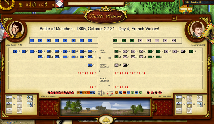 Davout’s attack on Munchen was only partially successful. The attack kicked off under muddy conditions and failed to develop the momentum needed to dislodge the Coalition defenders. After suffering nearly 10,000 casualties, the Coalition force withdrew into the city. A significant number of Coalition units were routed in the battle leading me to conclude that their cohesion levels are low.