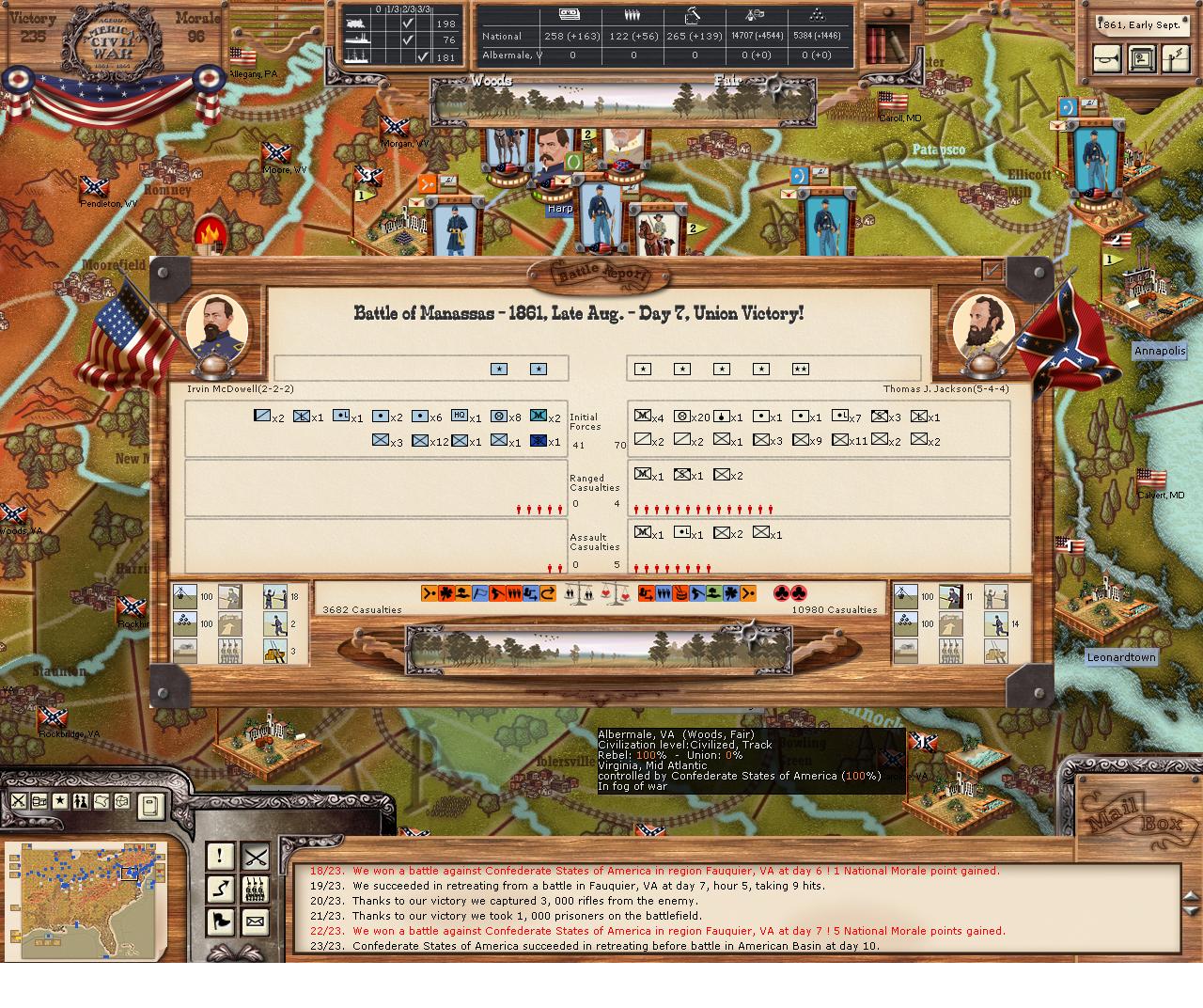 Mansfield successfully destroyed the remnants of Johnston Coprs, earning him a commendation. Promoting him at this point however would probably anger General Burnside who has a higher seniority. Johnston himself managed to flee to Winchester, where he is now besieged by Keyes and Hunters Division.