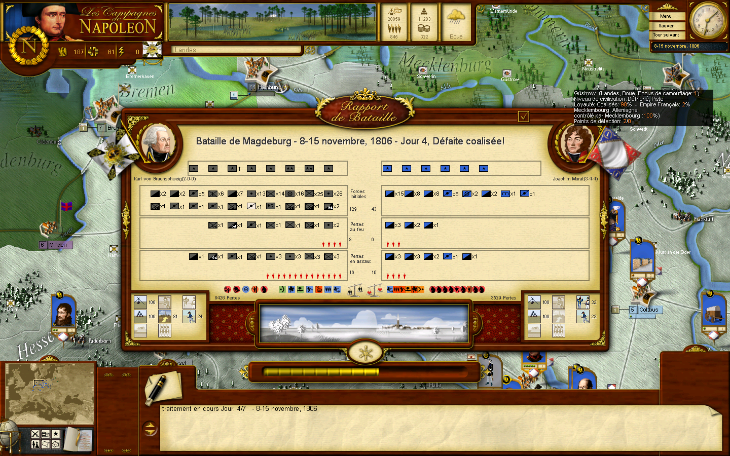 The second battle has nothing special, Murat succeed in disengaging at round 2, so the only one round seems to be an exchange of artillery fire, where Murat is particularly lucky (many good dices from what I see).