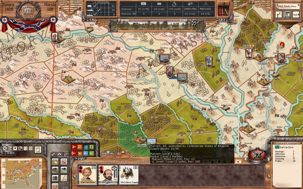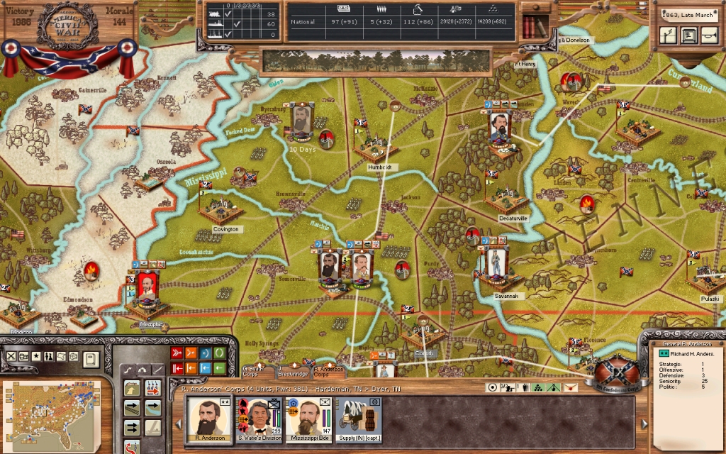 The advance of this army was checked by a much larger Federal force under General Pope three days ago. My fear that his force would advance south from his positions at Clarksville came true. It appeared, at first, that my army held the advantage in numbers, but the Federals seemed to make an appearance just in time with reserves upon the center right of our line.