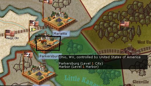 How is this useful? If you look closely in the box for Parkersburg, you can see that there are 2 units, and that they are entrenched to at least level 4, probably 5+. Also, I see that at least one is a unit containing artillery. Since the entrenchments are "in the city" so to speak, both units are garrisoning the city. Which allows me a great chance to sneak in and place the city under siege.