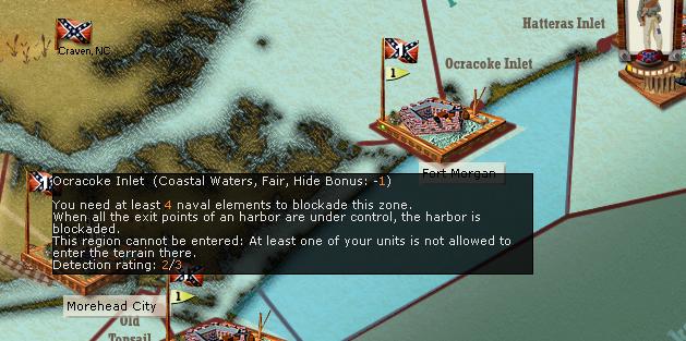 Fort Morgan, has a detection of 3/4 due to the garrison (standard garrison). This leads to a detection of 2/3 in the sea zone next to it (in this case Ocracoke Inlet). However, the normal detection values are not kept at sea. How so you ask? Well if you look 2 sea/river areas over from your fort, the detection value is 0. :bonk: This means that a ship that is 2 zones away from a fort (read artillery unit) is virtually hidden (detection value of zero). Try it in your game (check the Mississippi river somewhere not next to your forts or artillery)
