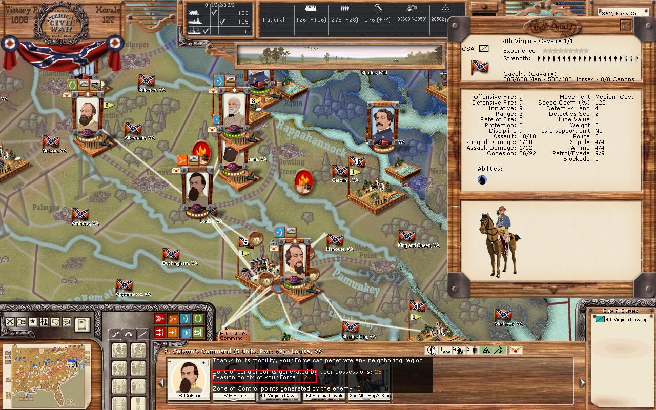 Look at the 4th Va Cav’s evasion rating. See the difference. Originally 12, now 25. Now they'll come back lots more often and you won't have 10 generals mopin around in Richmond anymore with nothin to do.