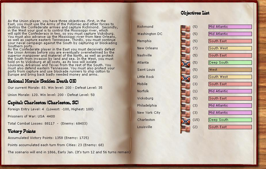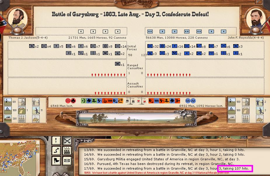 There were 3 minor and 1 major battles this turn. There were 2 minor naval battles, and Charleston harbor was able to bombard the union for 129-7 hits.