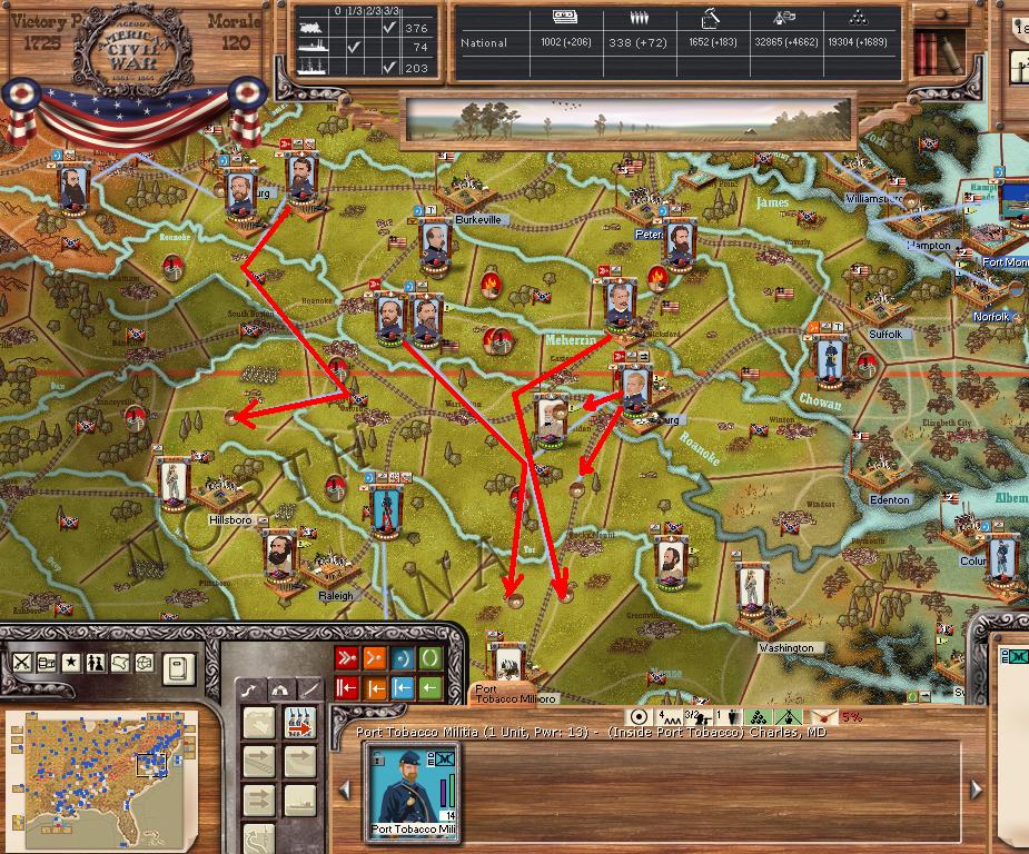 AOP - Meade moves south going through the ANV, HQ moves south. AOC recovers cohesion. AOT assaults Montgomery, with Sherman attacking Johnston.