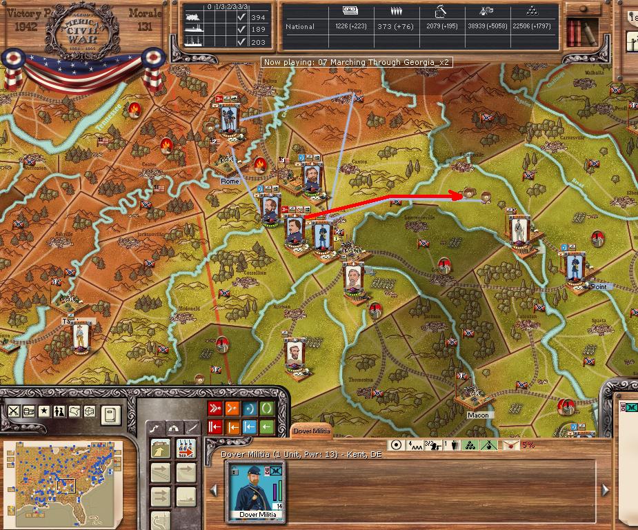 AOP attempts to push through the ANV (3 corps + HQ). AOC attacks Atlanta with 2 corps and the HQ. AOT moves towards Montgomery, with Sherman chasing Johnston.