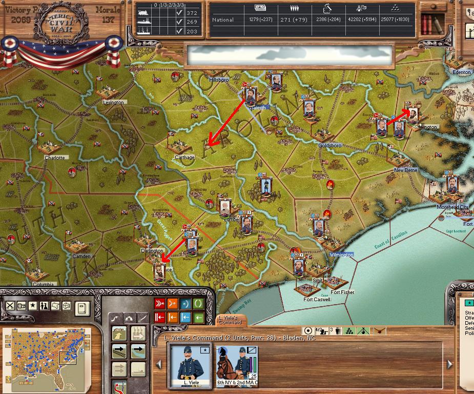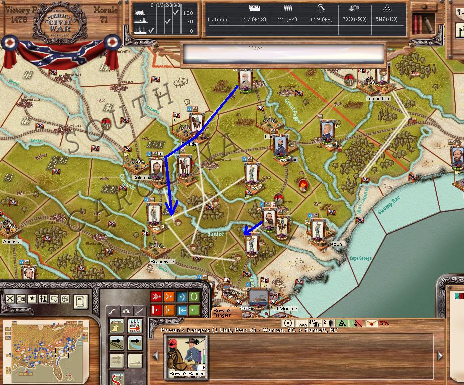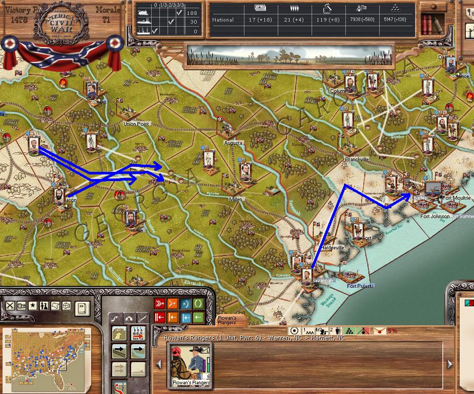 AOP attacks SW towards Florence SC (attacking through Longstreet. and Lee). AOC holds position. AOT moves east into Georgia.