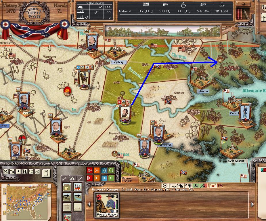 Jackson assaults Edenton NC, Lee Sw to Branchville SC, Longstreet SW 1 region, and Bory to Charleston. AOT moves east 2 regions. Hardee and Forney move 3 regions east.