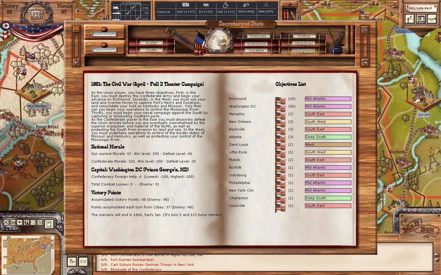 On the Objectives page, all of the objectives apart from Richmond, Memphis and Nashville are shown as Union controlled. As it is Oct, 1861, New Orleans, Mobile, Atlanta, Little Rock, Charleston, Norfolk and Vicksburg are still CSA cities.