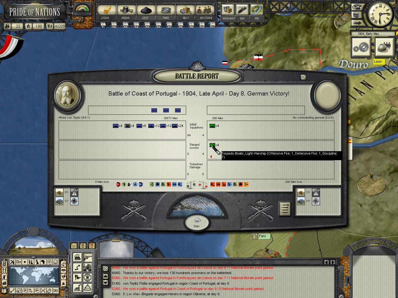 Our forces commanded by GO. von Kluck, have finally defeated the bulk of the portuguese army and captured Lisboa. Tirpitz contribution to this victory was immense as we managed to coordinate our naval and land forces to act in unison. Our Nation's morale is very high as this war seems to be basically over and it was swift as the Emperor had promised. Now it's only a matter of time to negotiate the peace terms.