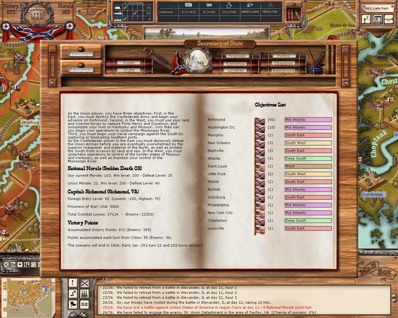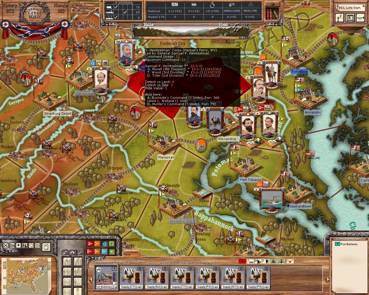 Alrighty, my last AAR was overly short, and I will try your collective advice next time I play as the Union. The big deficiency was trying to write the last one during my lunch break where I could not actually launch the game to review myself. So on this one. I am going to post the pictures of the end result and you can all say whatever you like about what you see in the pictures. If you want more pictures to review, just ask and I will post anything I am able to. Such as perhaps a pic of Polk and his division in Northern, Illinois or images of all the cities that lack depots in his wake. If I go back and attempt to continue this combat, I still want to see if I can take Chicago. In the last turn (i didn't check after the "victory" he was surrounded by superior forces, 3 commanders and could not move to ANY adjacent location. So without further ado, view the pics!