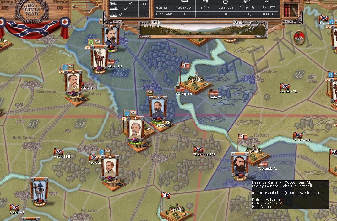 In Mississippi, the USA advance from the South is in full swing. The attacks come from the river. Port Hudson and Baton Rouge have fallen. Forrest remains entrenched at Springfield. In the North, Crittendon's Corps has arrived at Grant's location. A USA offensive seems inevitable aimed towards Corinth and Memphis.