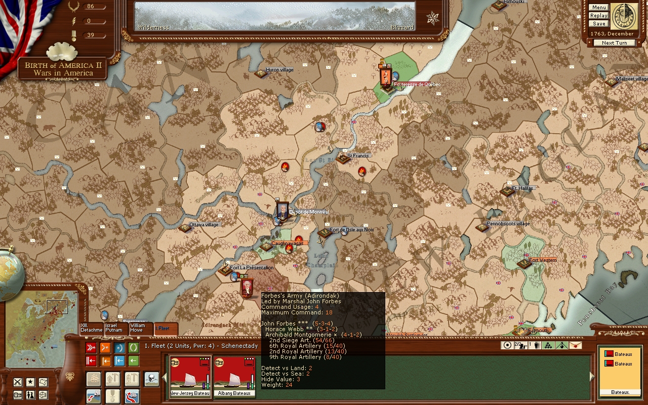 I started my conquest with Forbes I got Quebec in late game and move west to Montreal(he Started 2 star generals ended up with 3 and some experience in defensive rating). But Marques de Montcolm was waiting in montreal. When I was in adjacent region he attacked me and I severely lost the battle. My other army was in albamy. With Washington as a commander of my of the ragional(line infantry) forces and trained many of them but I was not really good at orginizing forces and it was very late for them to join the battle at Montreal.