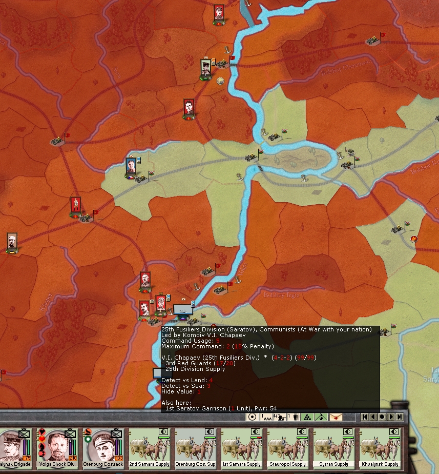 in very early stages of the game, Russian AI responding much quicker to my offensive moves as playing with Sıb white. North and south Volga, Even they have few men, adapting well to situation. It looks units moving with more concentrated and tight. Im sieging Saratov with 3-star Martynov and 2 brigades closing in.