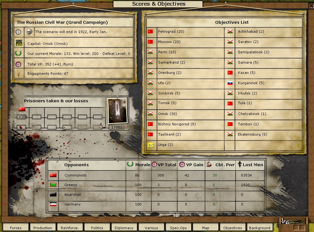 Kazan is under siege by General Almazov's second in command Garkin for 2 turns. There was a battle in Kazan against 3-star Bonch Bruevic.Bruevic lost the battle and couldn't retreat and stayed in the region. Kamenev army is just near the Kazan region. 2-3 gunboats patrolling around volga. SB NM 133 while red have 86: