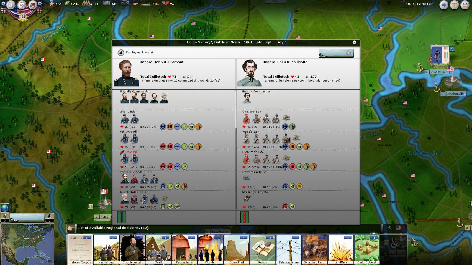 If your report was accurate then the 4th Ohio militia would have received a total of 50 hits in combat. Which is impossible since it only has 40 hits to take. Going into the 4th round the unit has already taken 22 hits and then supposedly takes 28 more in that round...