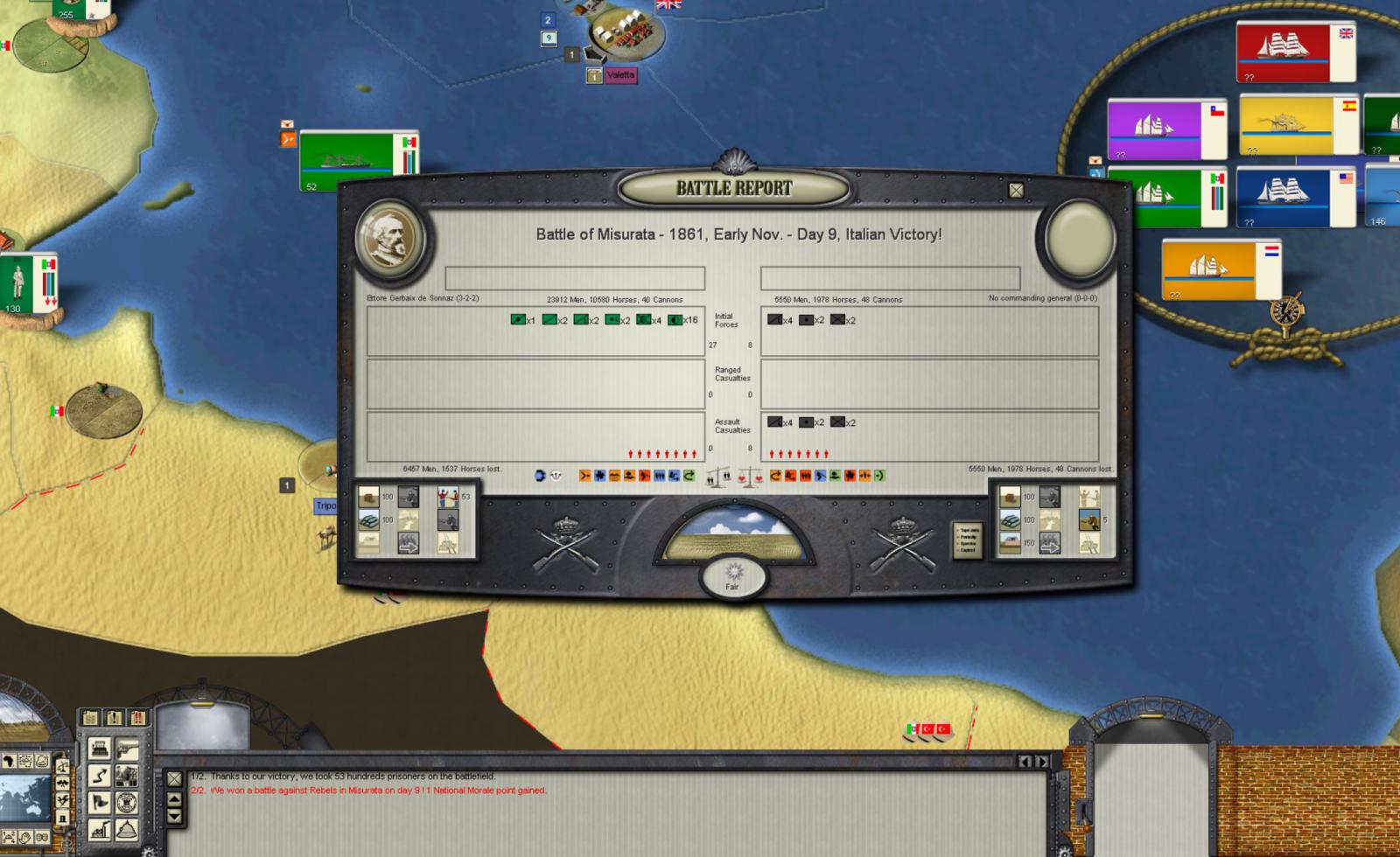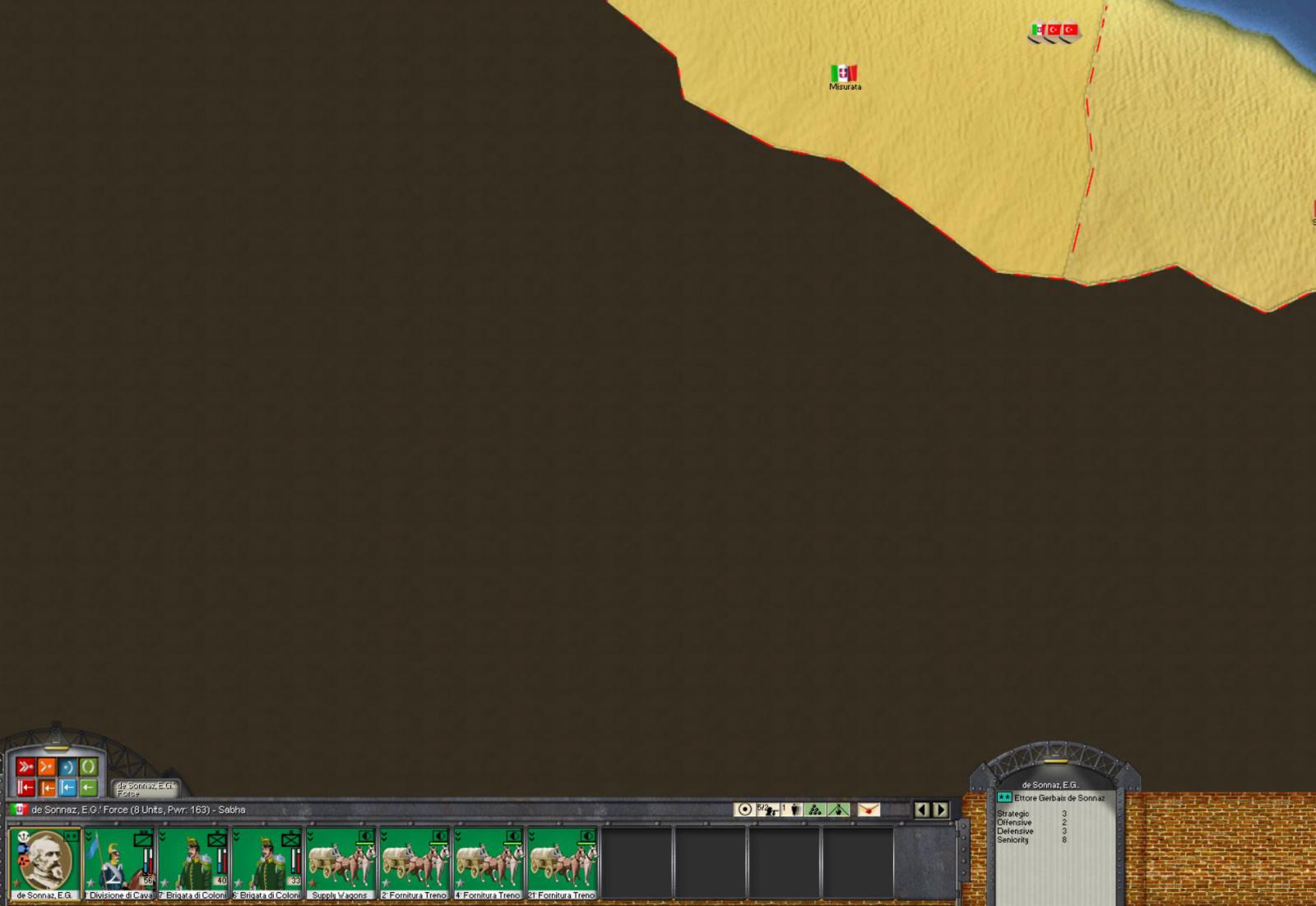 As Sardinia-Piedmont I guess I was snoozing at the wheel in allowing France to gain control of Tripolitania while I was in complete control of Tunisia, Gabes, and Gafsa- so I suppose I could have waltzed in and taken the locations from the rebels too. But alas, not the case. So I decide to take the rebel controlled territories Ottoman territories lining the coast from Tripolitania to Egypt, commencing with a landing at Misurata.