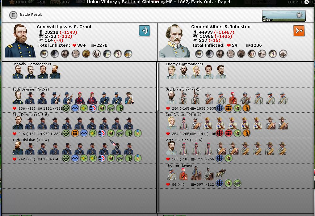 And Polk'force attempted to follow up on Johnston's victory with heavy losses. New Orleans surrendered. That will free up Crittenden's corp for offensive operations. I'm going to leave a division in New Orleans for defense.
