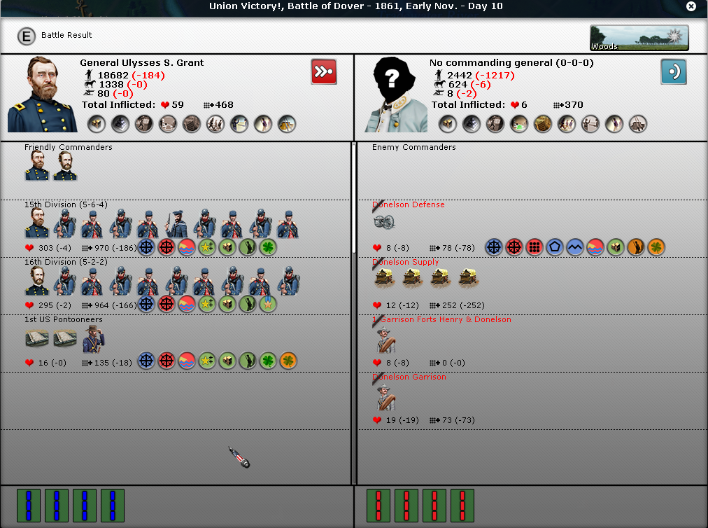 As you can see all of these battles seemed to only go one round. Those are some huge casualties for one round of combat in Alexandria. Shows what entrenched positions and an advantage in guns can do.