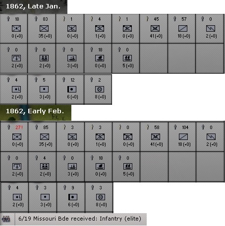 Cardinal Ape wrote:Also, for what its worth, I know that some 'missing hits' amounts in the replacement chit screen are not totally accurate. Some elements in mixed brigades count as missing hits for the wrong element type. This is easily seen with the Stonewall brigade appearing in early May '61, the light infantry in his brigade register as elite for the replacement tally. The brigade has 5 elements; 1 light infantry, and 4 elite infantry. The brigade is created at 30% strength, each element has 6 out of 20 hits. Looking at the 'missing hits' in the replacement screen, one can see that there is no missing hits for light infantry, but there are 70 missing hits for elites. Since the only elite elements on the field are those of Stonewall's brigade, which total at 56 missing, there is an extra 14 missing hits listed because it counts the 14 light infantry hits as elite, not light.